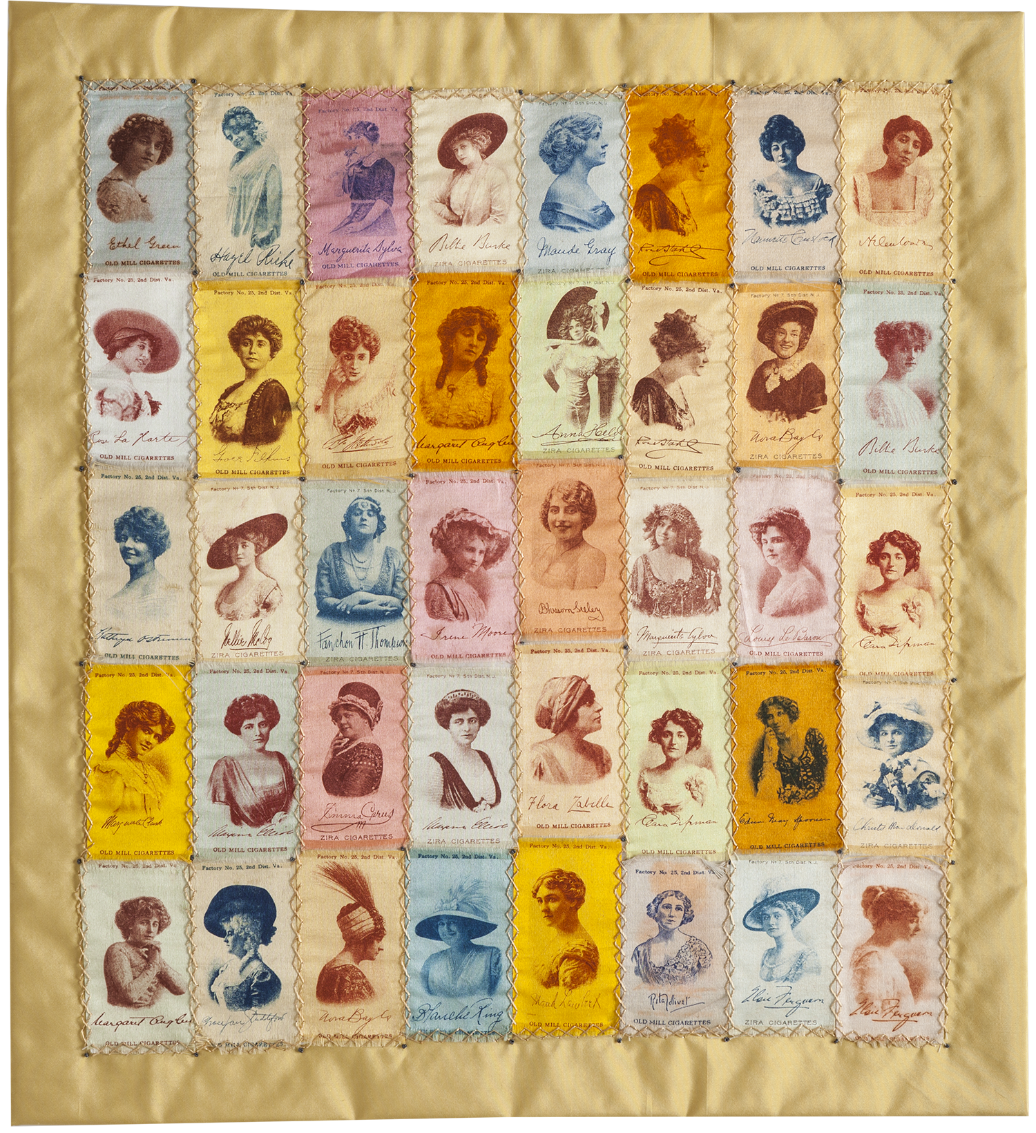 The first of what would become many quilts, pieced more traditionally in a grid anchored with french knots. Portraits of screen stars of the day with signatures. American Tobacco Company tobacco silkss, 1910.