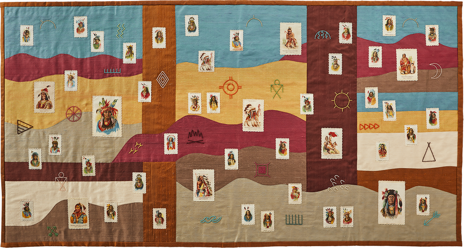 There were many versions of silks featuring illustrations of Native Americans, some indiviual portraits and some depicting daily life. Native symbols enhance the narrative. Silk dupioni and glass beadwork. American Tobacco Company, 1910.