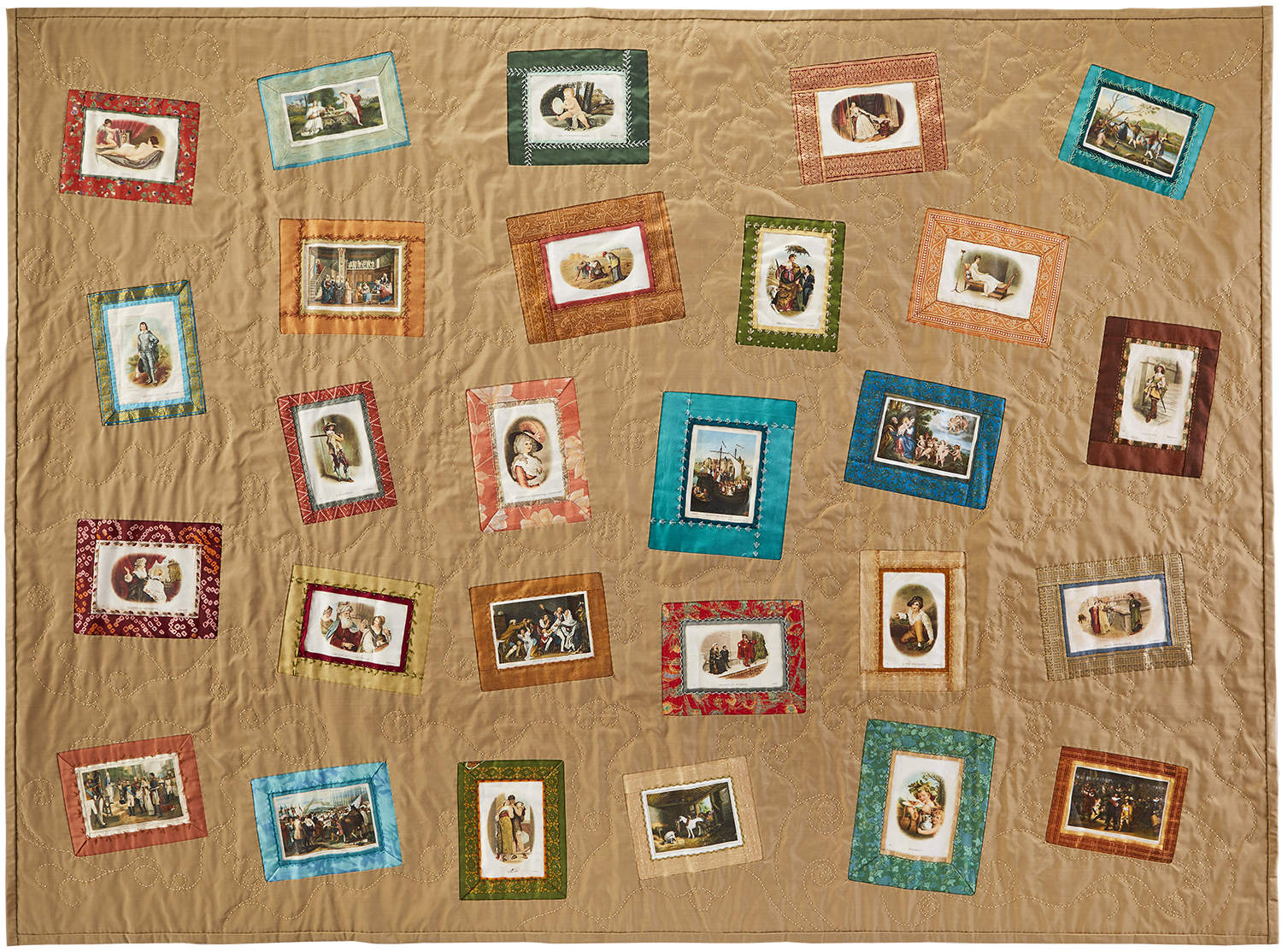 Gorgeous reproductions of old masters paintings showcase the quality of the chromolithographic printing process in these silks. Framed and embellished with intricate swirls of gold beads. Godfrey Phillips Tobacco Company, 1912.