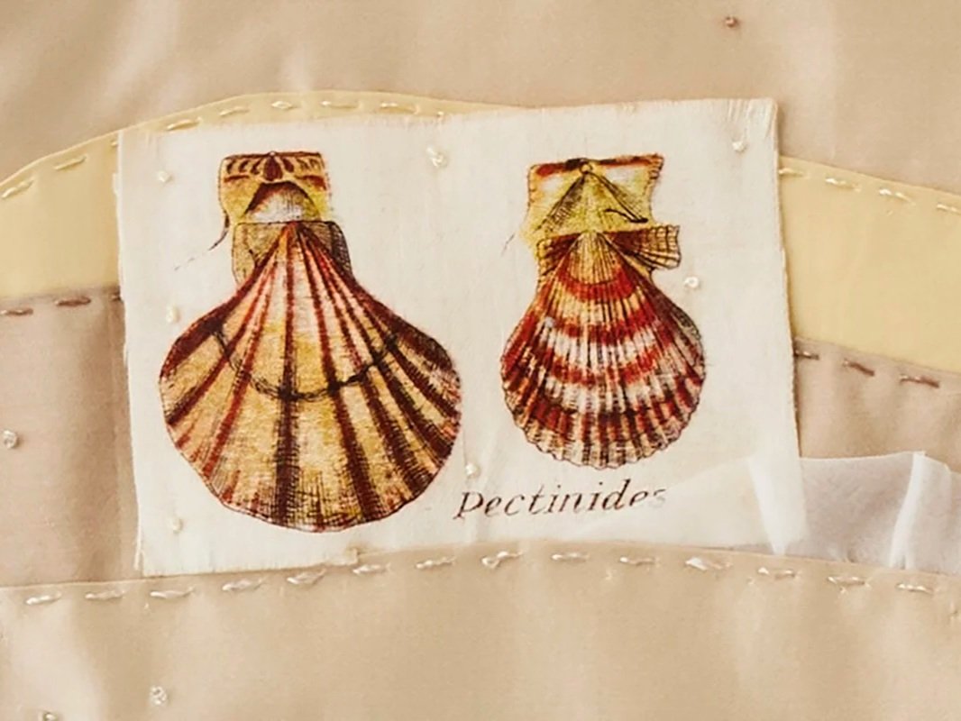 Very rare and delicate, these seashell silks make an unusual and contemplative series that would intrigue naturalists and collectors. French knots, glass beads and undulating waves of silk taffeta and organza create the ocean floor. Manufacturers, 1928.