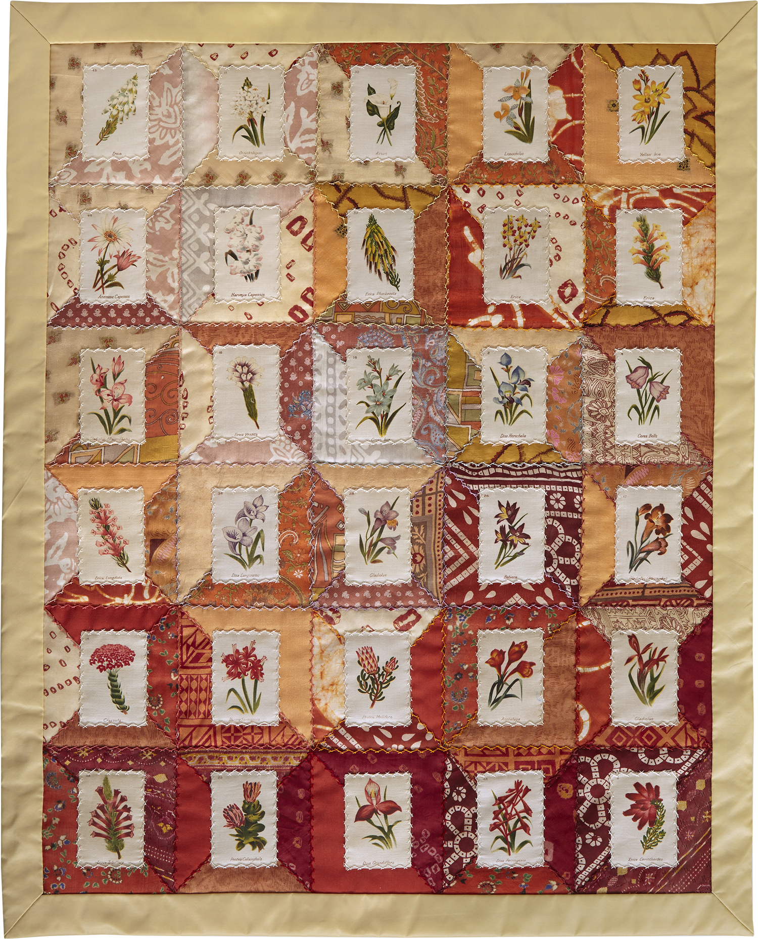 A beautiful warm palette makes up this collection of South African flowers with coordinating silk sari fabric patches. United Tobacco Company, 1913.