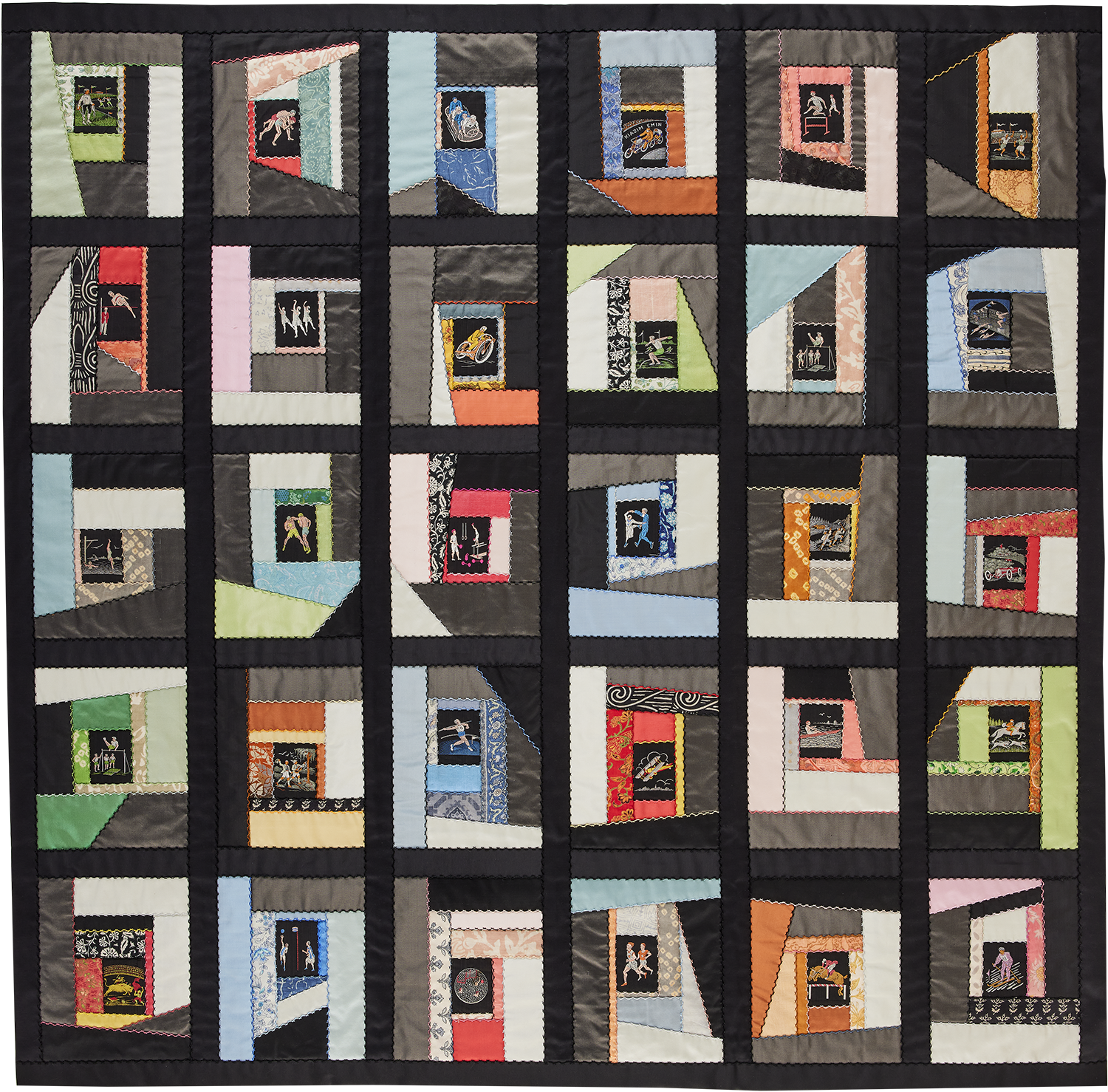 Woven silks depicting sporting figures in their fields. Patches of coordinating silk and patterned sari fabric in connecting shapes and colors accentuate the individual subjects leading the eye into the action. Turmac Tobacco Company, 1930.